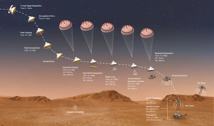 對(duì)進(jìn)入,下降和降落(EDL)系統(tǒng)如何將火星車安全降落在火星表面上的功能進(jìn)行了高級(jí)描述。圖片由NASA / JPL-Caltech提供