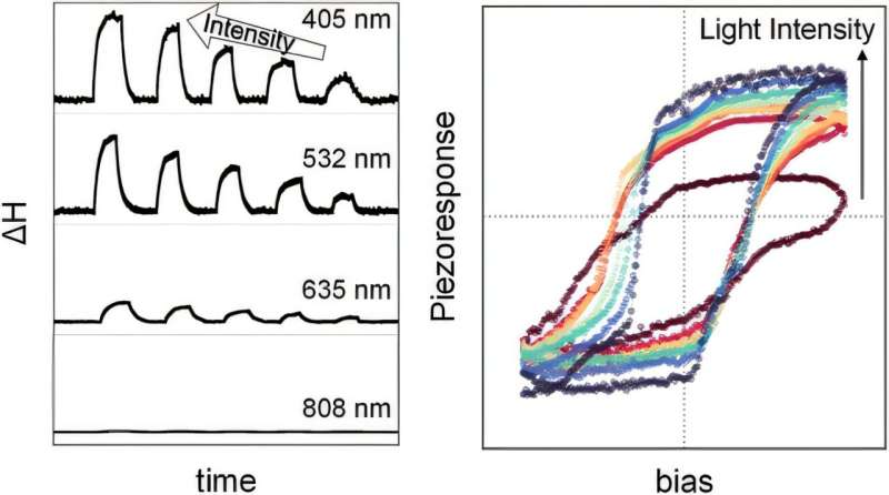 如今,該研究團隊已在無束縛的 BiFeO(一種多鐵性材料)薄膜中,成功觀測到可見光照射下的顯著光致伸縮效應。