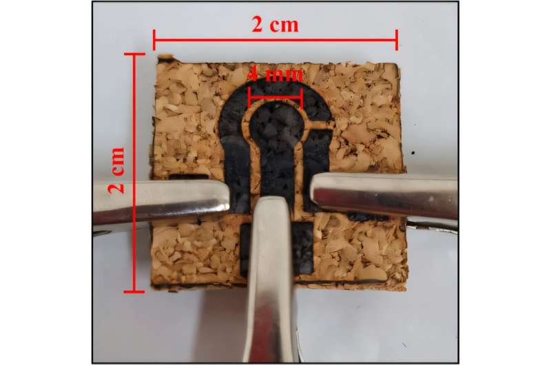 下一步,研究人員向軟木表面噴涂防水噴霧,防止液體滲入軟木內部影響傳感器的檢測響應;再涂抹一層指甲油以界定激光改性區(qū)域;隨后將軟木樣品放入 40°C 的烤箱中烘干 30 分鐘,同時優(yōu)化激光加工參數(shù)。