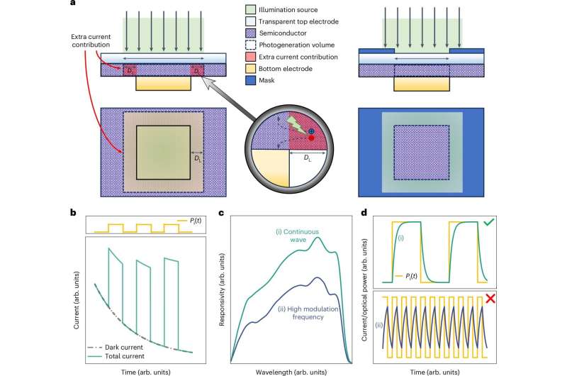 響應(yīng)度 / 外量子效率(EQE)表征面臨的挑戰(zhàn)。a 圖:左側(cè)為入射光束過(guò)填充現(xiàn)象,載流子產(chǎn)生區(qū)域超出標(biāo)稱活性區(qū)域,延伸至特征尺寸為 DL 的外圍區(qū)域,導(dǎo)致響應(yīng)度 / EQE 測(cè)定不準(zhǔn)確;右側(cè)為采用孔徑法實(shí)現(xiàn)響應(yīng)度 / EQE 的準(zhǔn)確測(cè)定。b 圖:在器件承受多束功率為 Pi (t) 的光脈沖期間,監(jiān)測(cè)隨時(shí)間變化的暗電流對(duì)準(zhǔn)確測(cè)量響應(yīng)度 / EQE 至關(guān)重要。c 圖:調(diào)制頻率選擇不當(dāng)對(duì)連續(xù)波光響應(yīng)度 / EQE 表征的調(diào)制測(cè)量結(jié)果產(chǎn)生影響。d 圖:c 圖所示效應(yīng)的時(shí)域示意圖,上方為合適的調(diào)制頻率,可通過(guò)調(diào)制測(cè)量準(zhǔn)確測(cè)定連續(xù)波光響應(yīng)度 / EQE;下方為不合適的調(diào)制頻率。來(lái)源:《自然光子學(xué)》(2025)。DOI:10.1038/s41566-025-01759-1